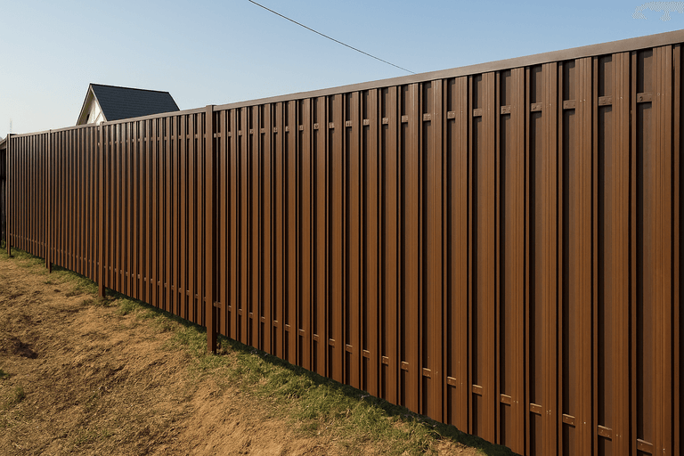 Забор из металлического штакетника — это надежное и эстетичное ограждение, подходящее как для частных домов, так и для промышленных объектов. Конструкция представляет собой набор вертикальных металлических ламелей, закрепленных на поперечные лаги, установленные на столбы.